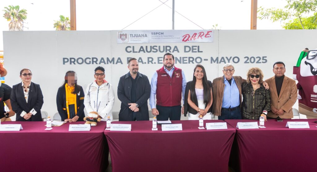 Tijuana, Baja California, a 5 de junio de 2025. El presidente municipal, Ismael Burgueño Ruiz, encabezó la entrega de constancias a escuelas que participaron en el programa D.A.R.E, que en el periodo enero a mayo de 2025, benefició a 2 mil 921 estudiantes de primaria y secundaria de 30 planteles educativos de Tijuana, durante la ceremonia de clausura del curso.